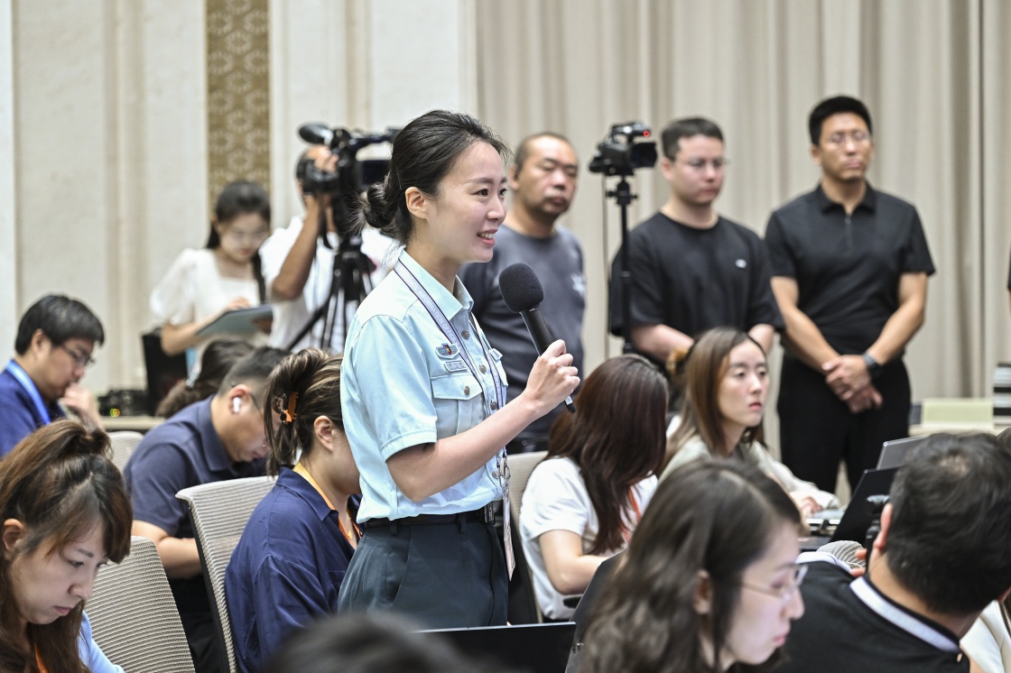 8月20日,國務院新聞辦公室在北京舉行新聞發布會,閱兵領導小組辦公室副主任、中央軍委聯合參謀部作戰局少將副局長吳澤棵,中國人民解放軍中部戰區閱兵指揮機構辦公室常務副主任、政治工作部少將副主任徐貴忠介紹閱兵準備工作有關情況,并答記者問。這是記者在現場提問。
